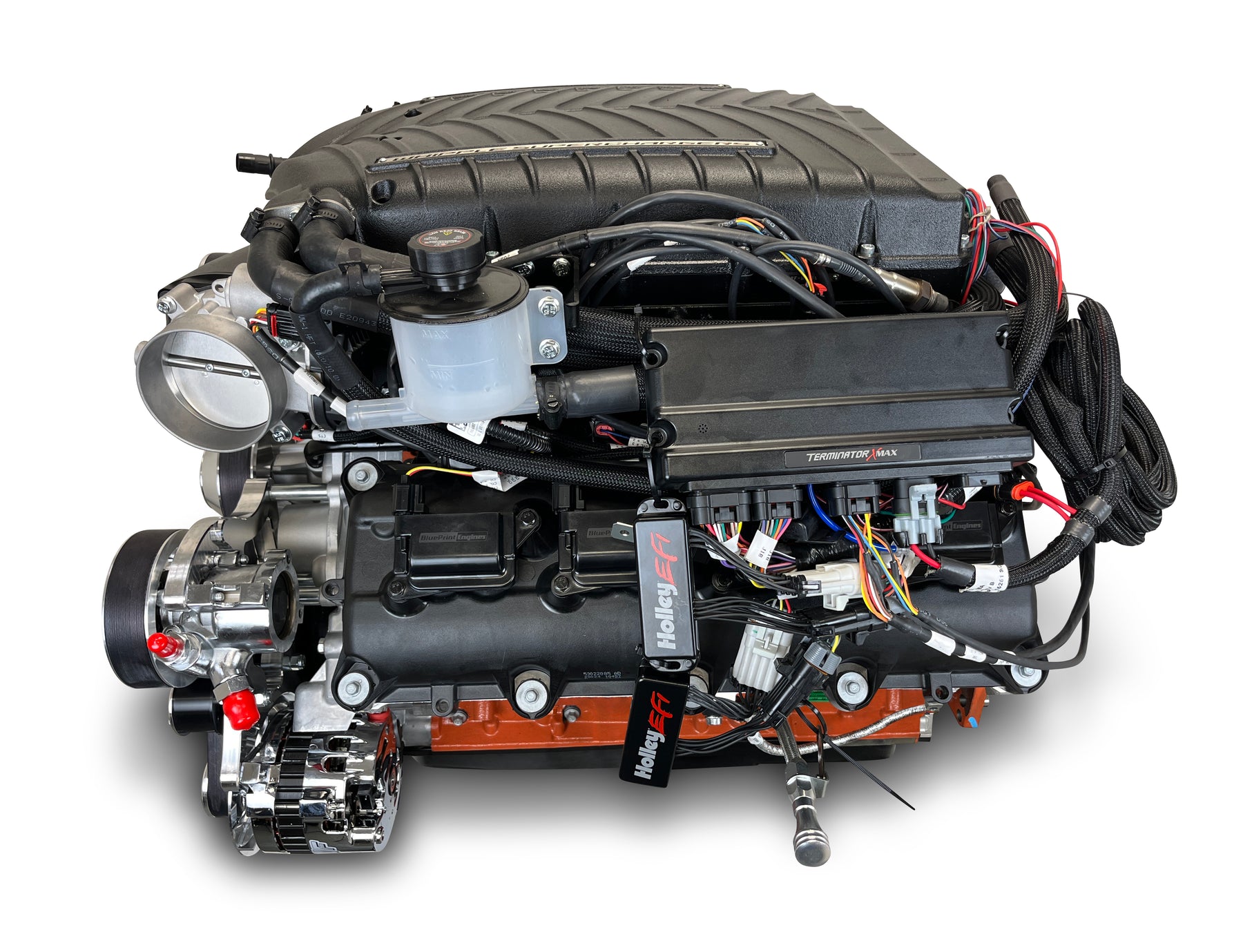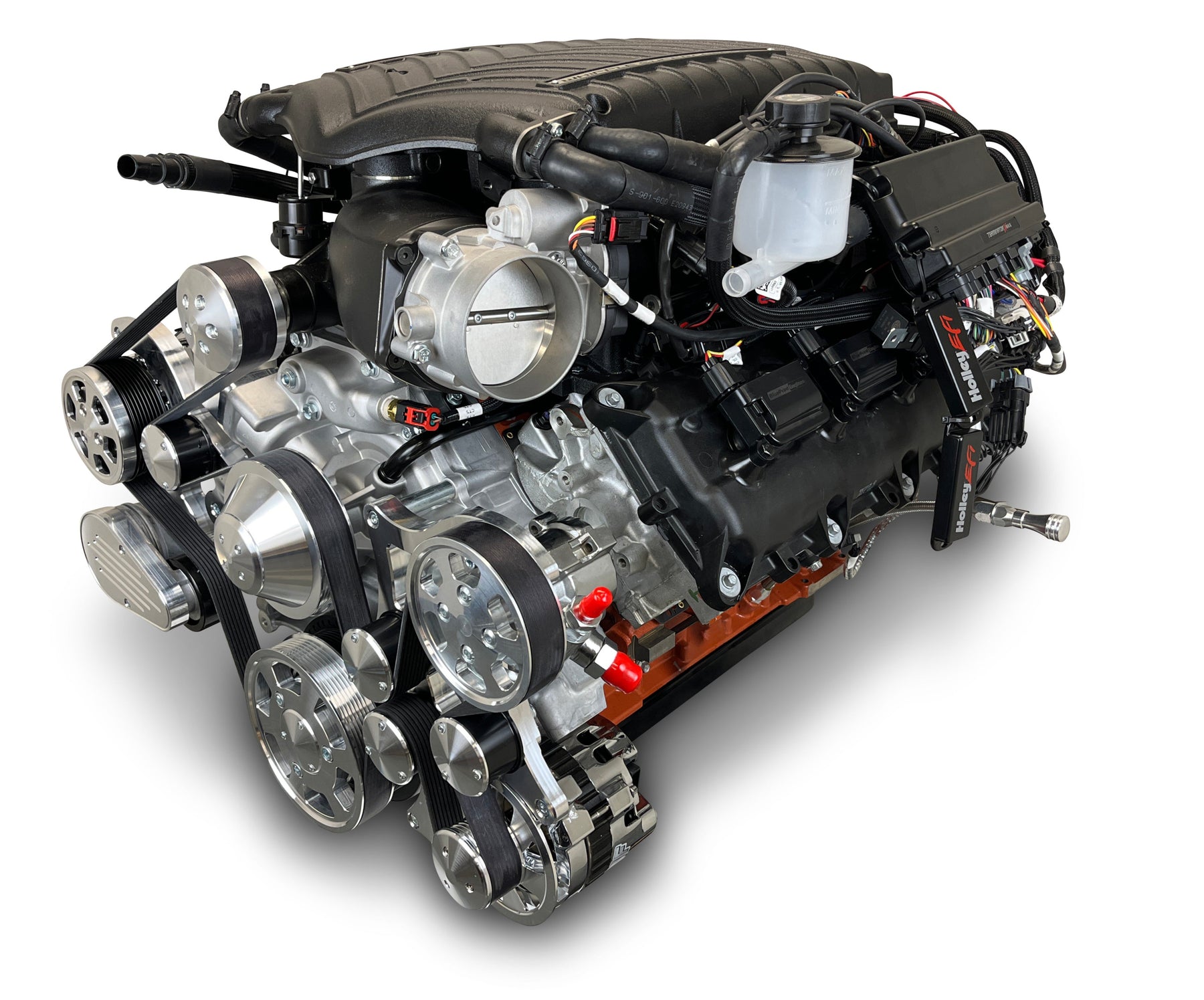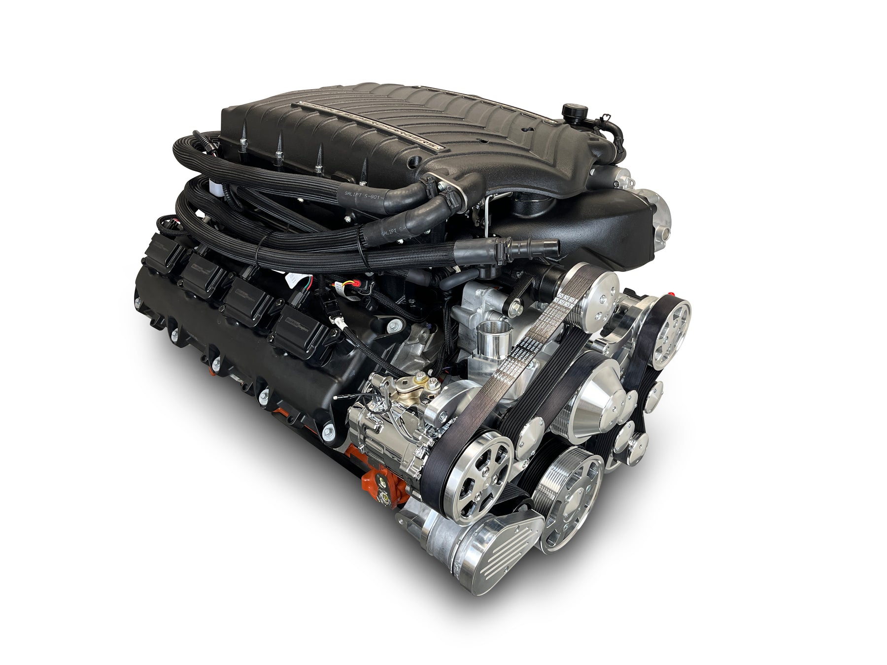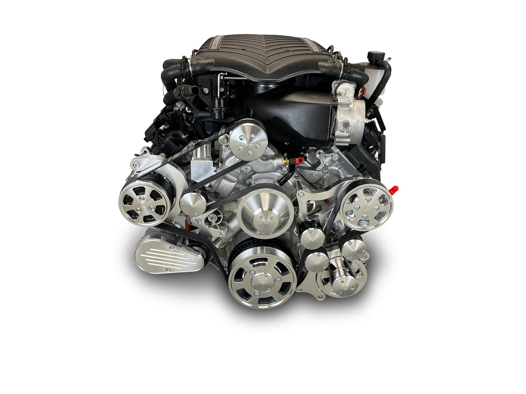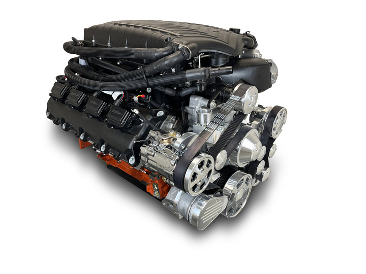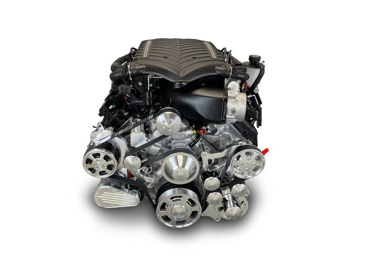 This BluePrint Engines supercharged Gen III HEMI crate engine is a complete, high-performance package delivering an impressive 872 horsepower and 764 ft-lbs. of torque, built on a foundation of premium internals including a forged crank, forged pistons, and a hydraulic roller cam. Featuring Gen III HEMI Apache aluminum cylinder heads and topped with a Whipple 3.0L supercharger and Hellcat throttle body, this setup delivers instant boost and massive power with street-able manners. A Holley Terminator ECU controller kit with wiring harness manages the fuel and ignition systems for precise tuning and reliable operation. Supporting components like the supercharger coolant reservoir, harmonic balancer, spark plugs, coils, timing cover, valve covers, and muscle car-style mid-sump oil pan ensure the engine is ready for swap applications. A black front accessory drive system rounds out the build, featuring a water pump, Type II power steering pump with remote reservoir, 140-amp 1-wire alternator, and 7B10 peanut-style A/C compressor, making this a true turn-key solution for enthusiasts seeking modern supercharged HEMI performance in a clean, ready-to-install package.