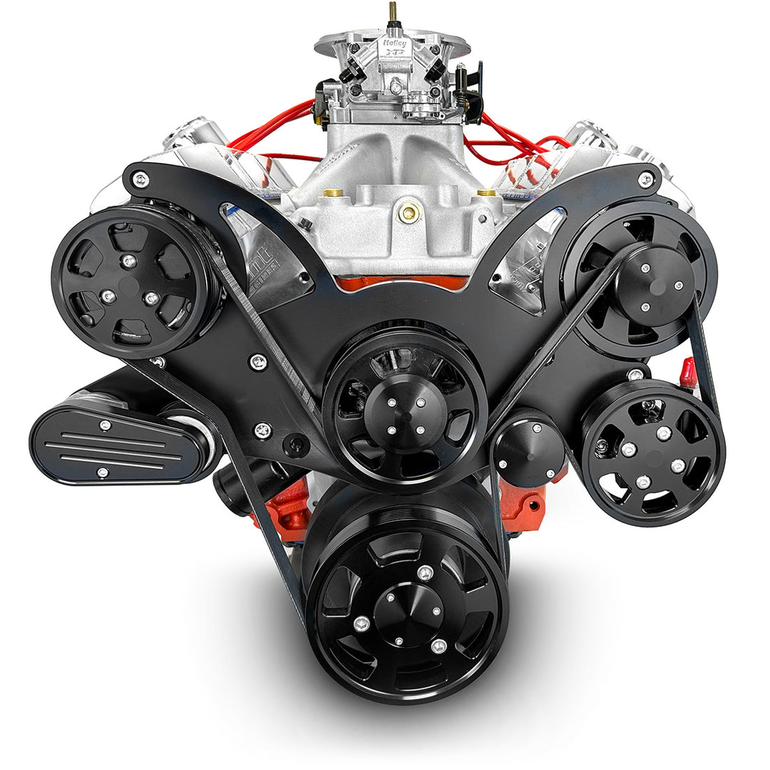 The front accessory drive on this engine fits many vehicles, however it is the customer responsibility to accurately measure and confirm fitment. Note this is a low-profile design, but things such as power steering hoses, alternator wiring, and additional fittings/fabrication may be required on some vehicles.